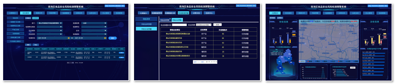 依托“互联网+大数据”以及专业快检技术,对区域食品安全风险监测网点所有食用农产品、食品检测数据进行采集、汇总(含法检、快检监督抽检、企业自检三类数据),逐步建立区域食品安全风险大数据中心。系统以大数据为基础分析,形成一个可快速发现风险、预警风险、处置风险、溯源风险、防控风险的监管闭环,让监管更具靶向性和高效性,全面提升地区食品安全监管智慧化水平。